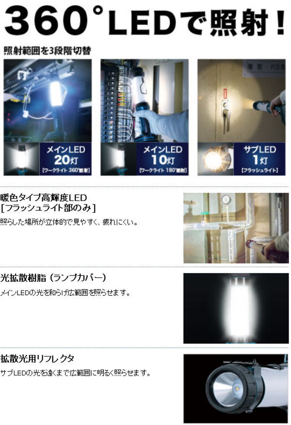 マキタ 充電式LEDワークライト ML806Y 商品説明 360°LEDで照射!フラッシュライト部に暖色系ライト採用 ※掲載商品の仕様、デザイン、生産国、発売時期は 予告なく 変更する場合がありますので、 あらかじめご了承ください。