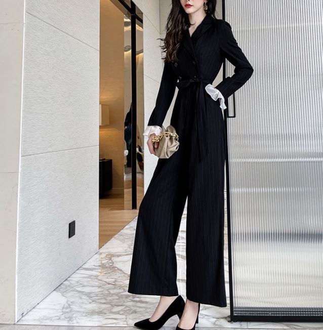 きれいめレディースファッション 【送料無料】 韓国ファッション 大きいサイズ S M L XL パンツドレス ストライプ柄 襟付き ロングパンツ スーツスタイル ウエストリボン 黒 パーティードレス きれいめ 結婚式 謝恩会 二次会 春秋冬 華やか おしゃれ セクシー 可愛い