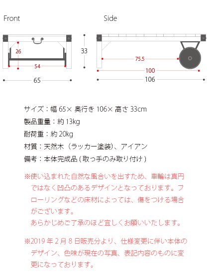 サイズ:幅65×奥行き106×高さ33cm 製品重量:約16kg 耐荷重:約20kg 材質:天然木(ラッカー塗装)、アイアン 備考:本体完成品(取っ手のみ取り付け)※使い込まれた自然な風合いを出すため、車輪は真円ではなく凹凸のあるデザインとなっております。
