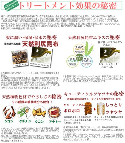 ・頭皮を傷めず、お家で簡単しっかり白髪染め・トリートメントだからさらさら艶のある髪に・白髪用ヘアマニュキアブランドシェア2011年・2012年・2013年全国第1位(出典「新・化粧品マーケティング要覧2012・2013・2014」(発行元:富士経済) )商品の説明 無添加・ノンシリコーンの利尻ヘアカラートリートメントは、お肌の弱い方や、白髪染めの負担を軽くするために開発した、無添加の白髪染めです。